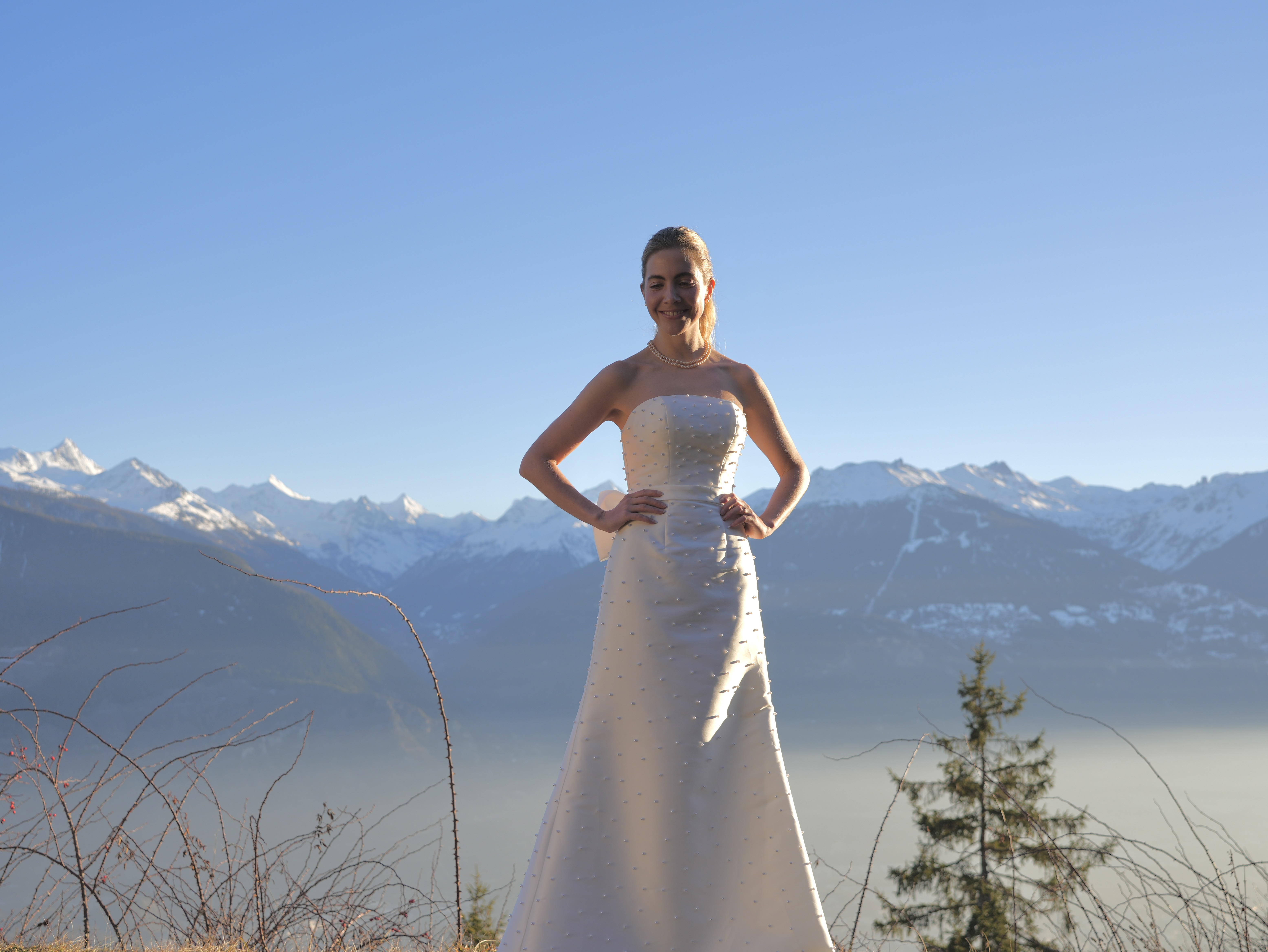 Marina embodies timeless elegance with her strapless A-line silhouette adorned with delicate pearl embellishments.